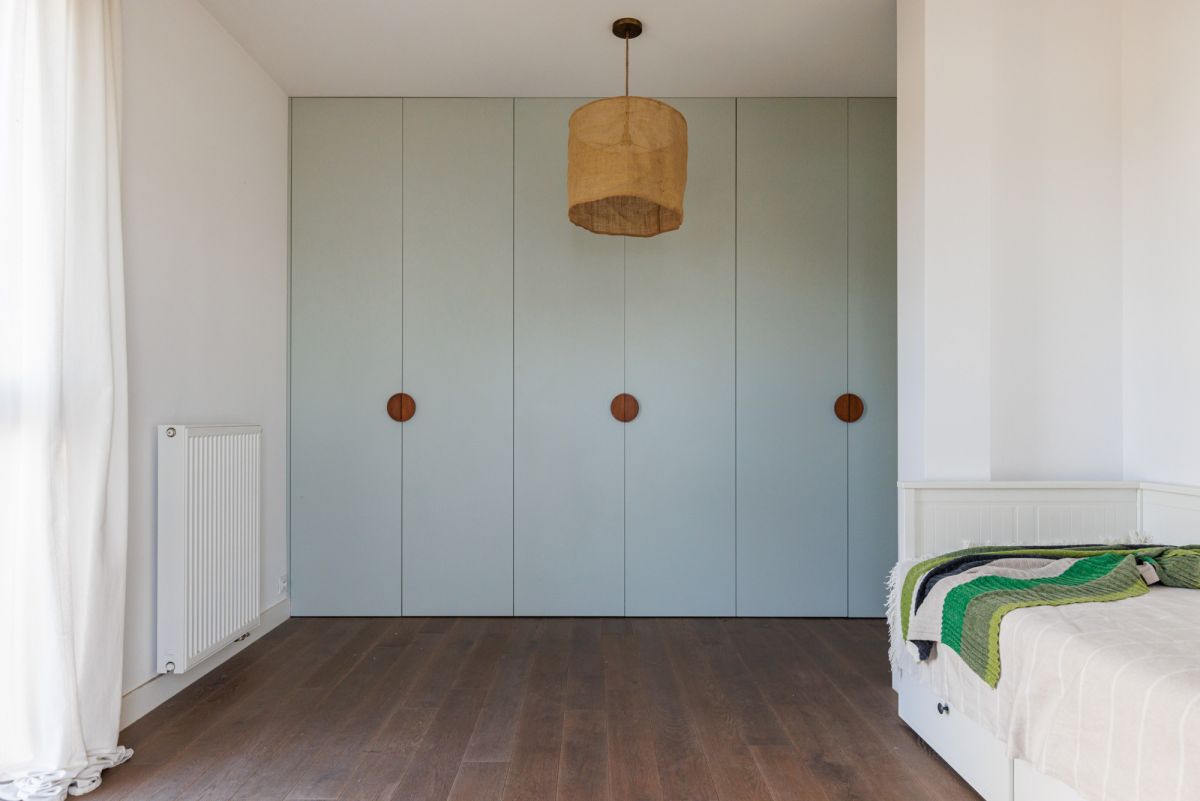 Na piętrze: zaprojektowano trzy sypialnie - w tym sypialnię master z prywatną garderobą i łazienką oraz dodatkową, ogólnodostępną łazienkę.