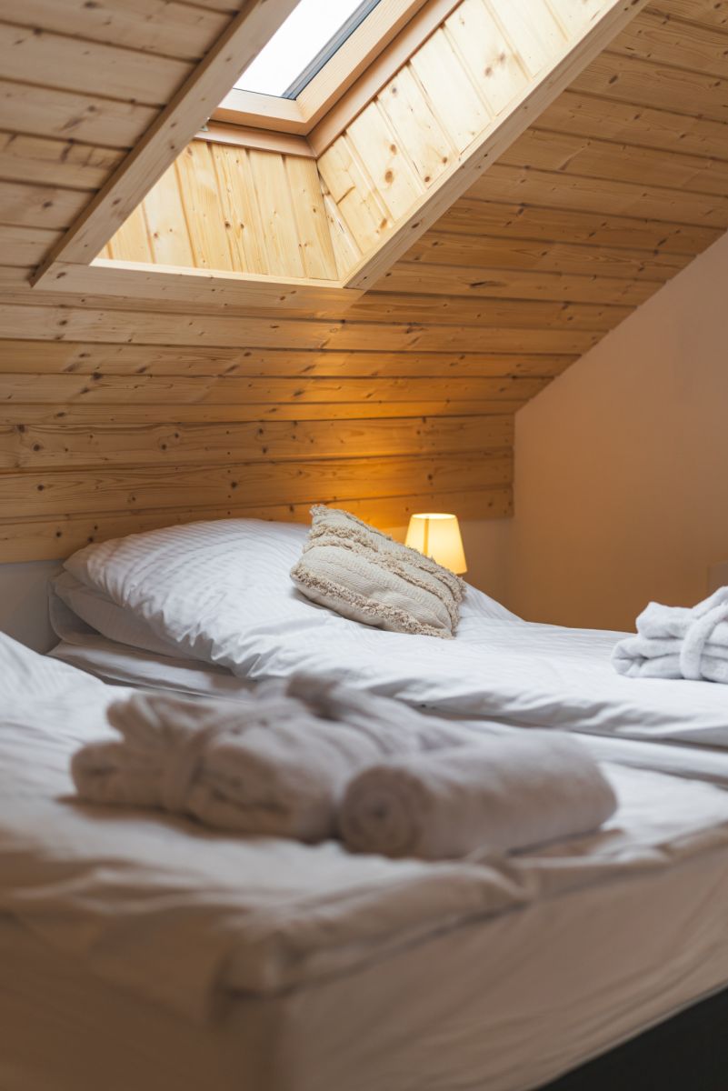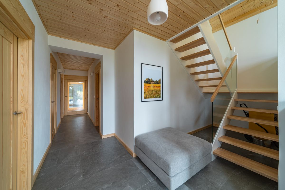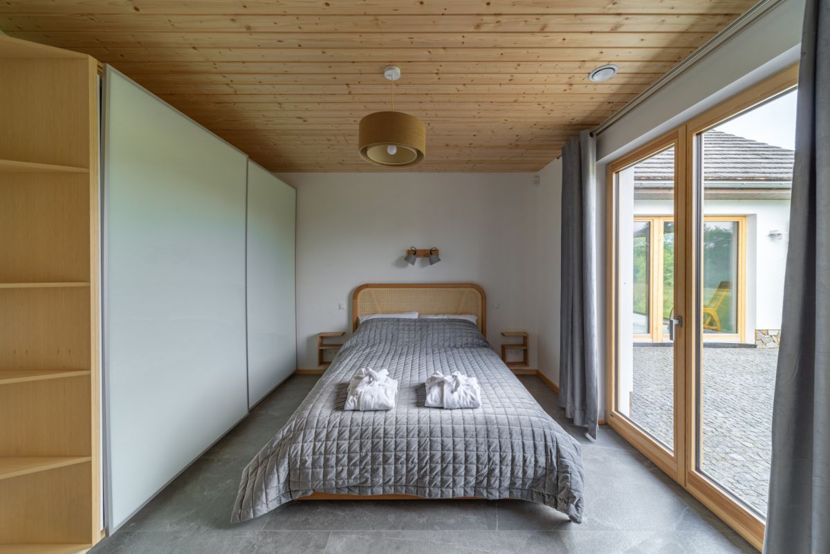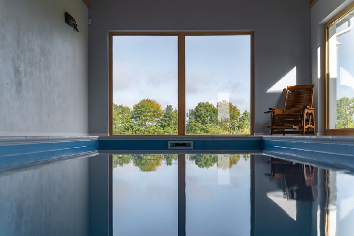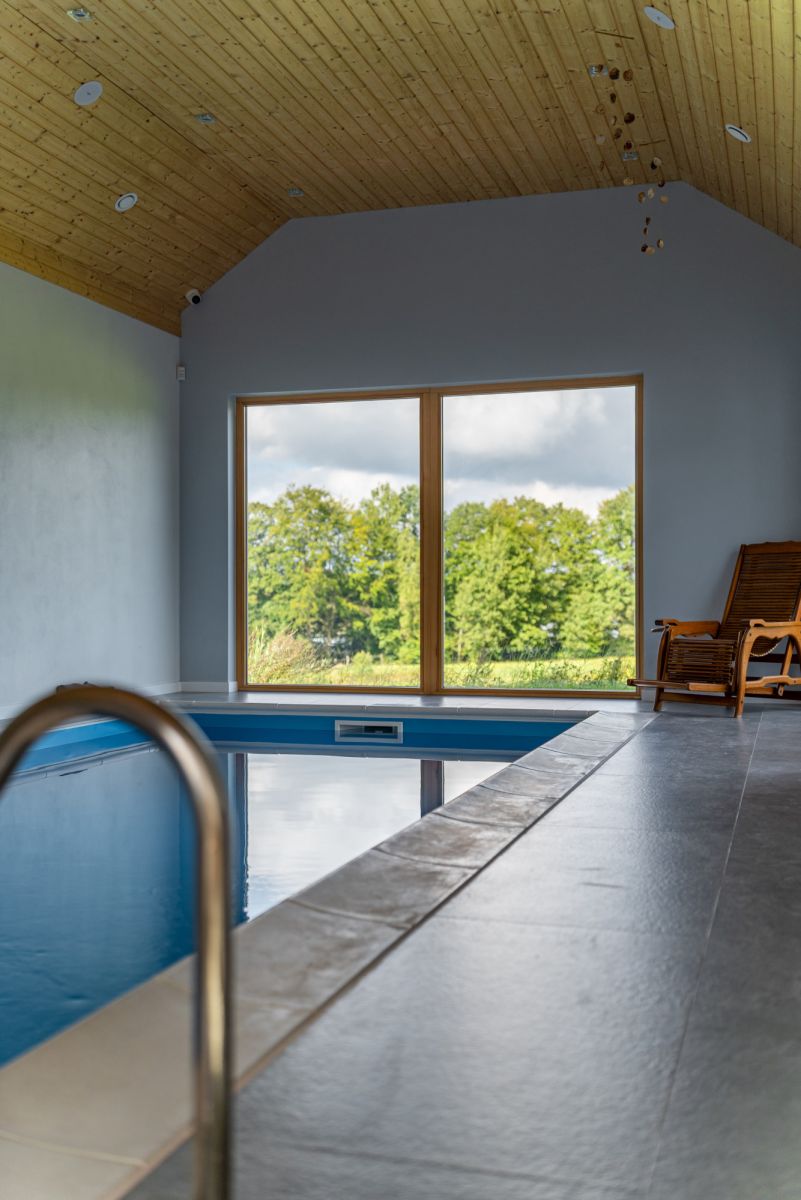 z kuchnią i salonem, z którego rozciąga się widok na bezkresne łąki i jezioro. Dodatkowo przy domu znajduje się prywatna strefa SPA z krytym basenem i sauną.