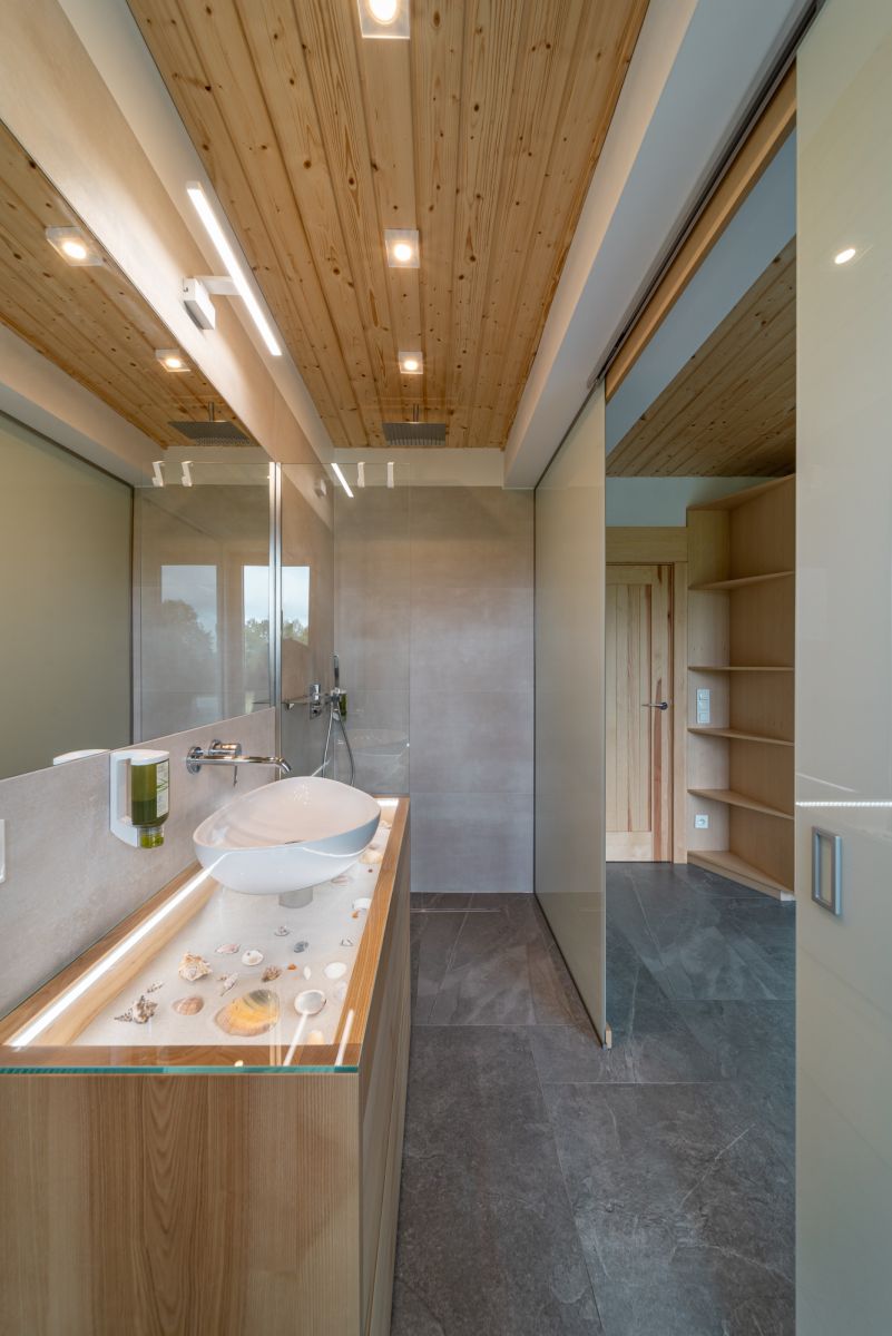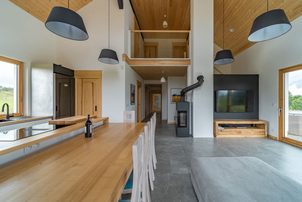 Wysokie sufity, duże przeszklenia i naturalne materiały tworzą atmosferę przestrzeni, światła i spokoju.
