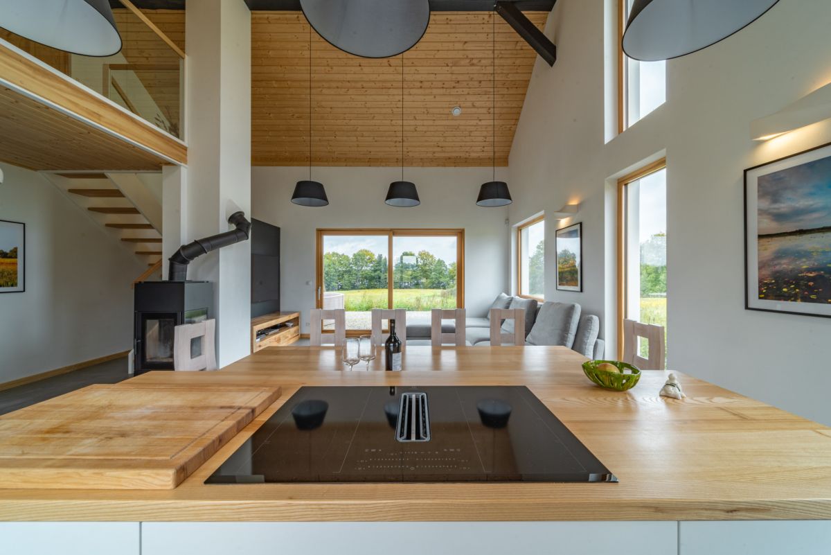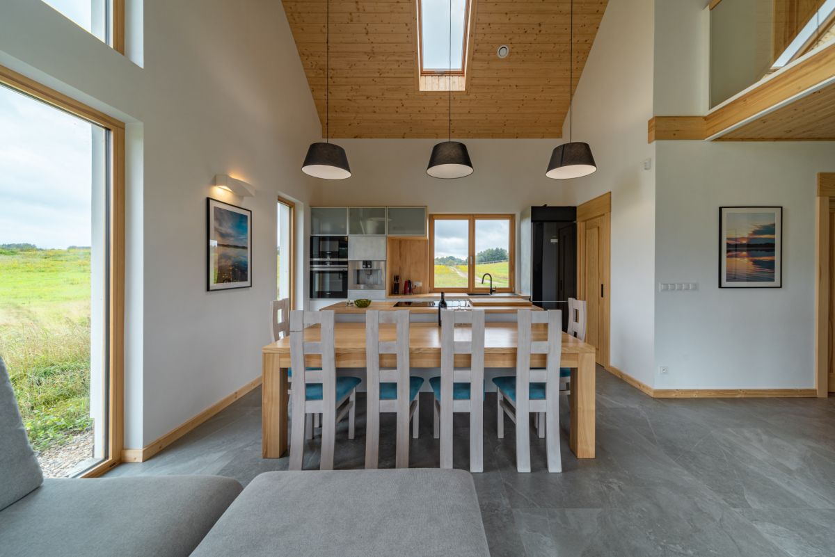* Otwarta kuchnia z widnym salonem i panoramicznymi widokami na łąki i jezioro