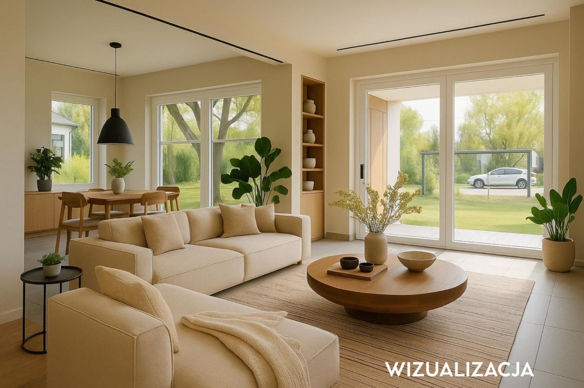 Przestronny salon z panoramicznymi przeszkleniami (okna HS)