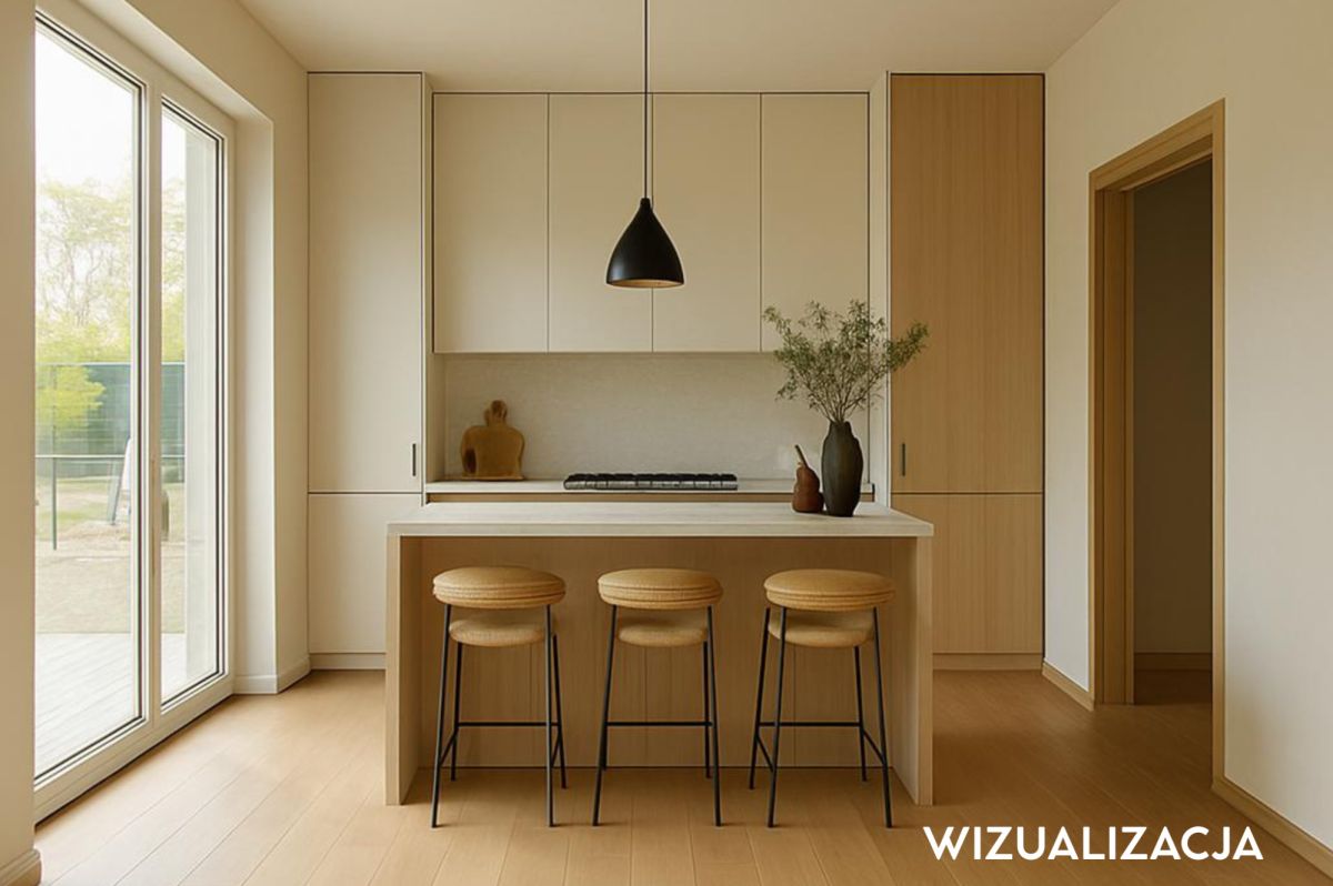 Widną kuchnię częściowo otwartą na strefę dzienną