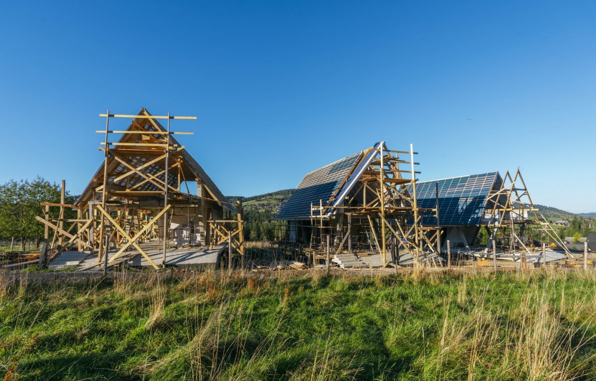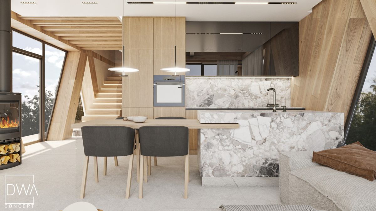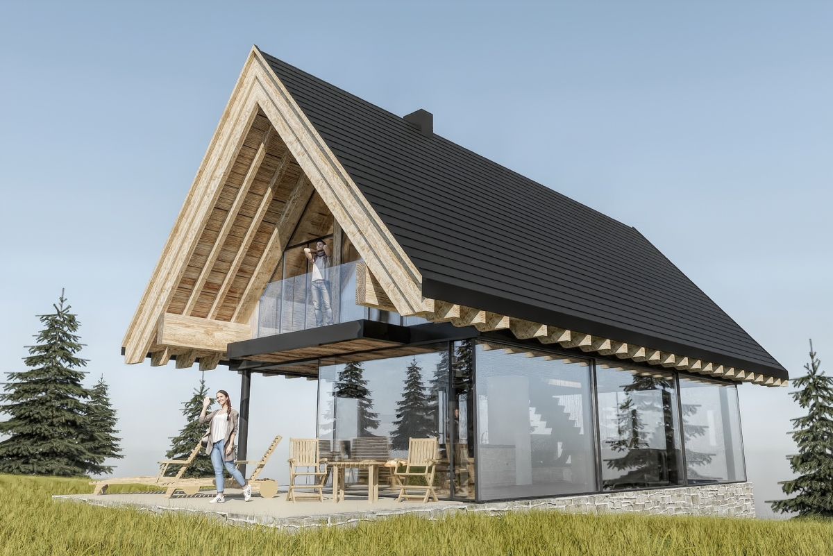 Elewacja domu wykonana z drewna, które w zestawieniu z szkłem panoramicznych okien tworzy niebagatelną nowoczesną kompozycję podkreślającą lokalny charakter nieruchomości.