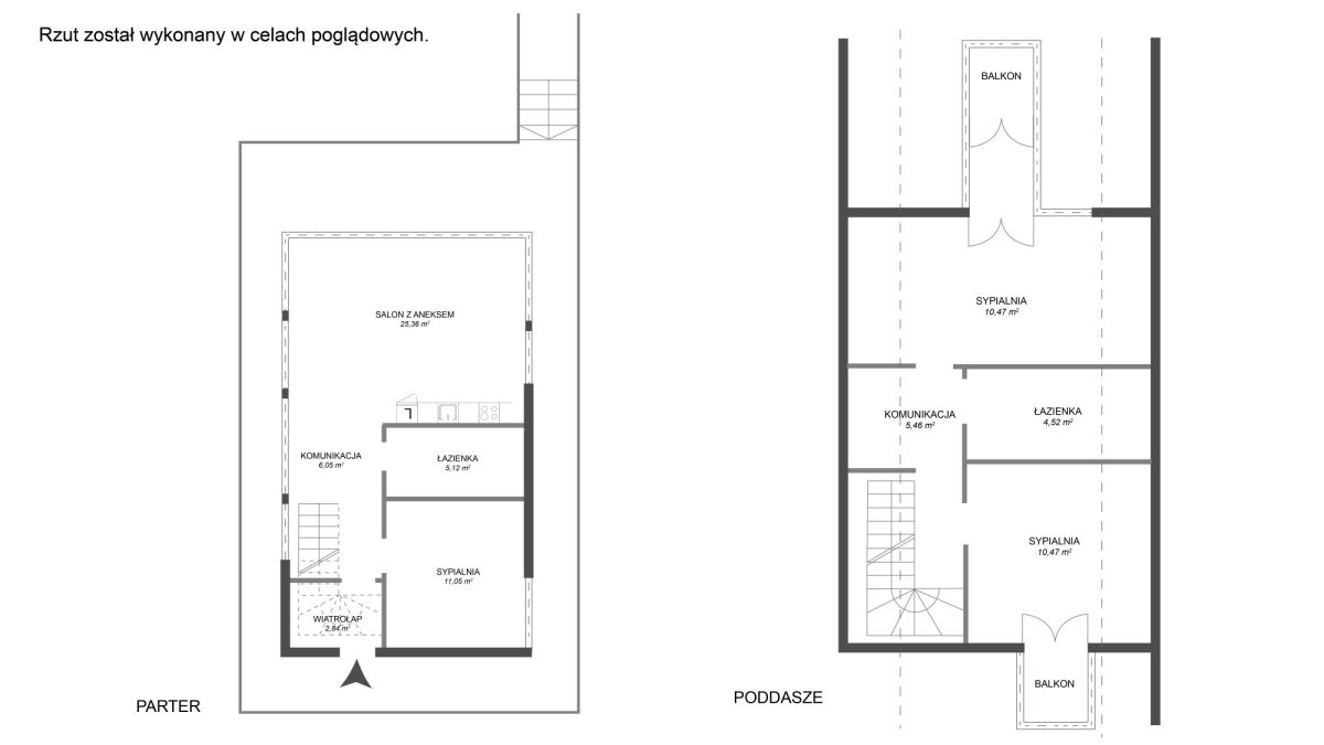• Poziom 0: salon z aneksem kuchennym i jadalnią (25,36 mkw), łazienka (5,12 mkw), sypialnia (11,05 mkw) oraz część komunikacyjna z wejściem do budynku (8,89 mkw)