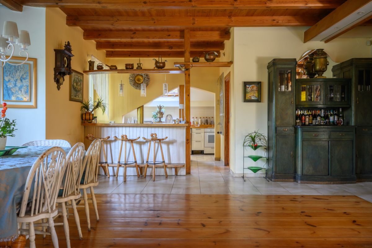 Parter domu ma klasyczny charakter. Duże okna zapewniają dopływ światła i sprawiają, że każde pomieszczenie jest dobrze doświetlone i jasne. Drewniane podłogi oraz antyczne meble nadają domowi charakteru. To wszystko stanowi dobrą bazę do własnej aranżacji domu.