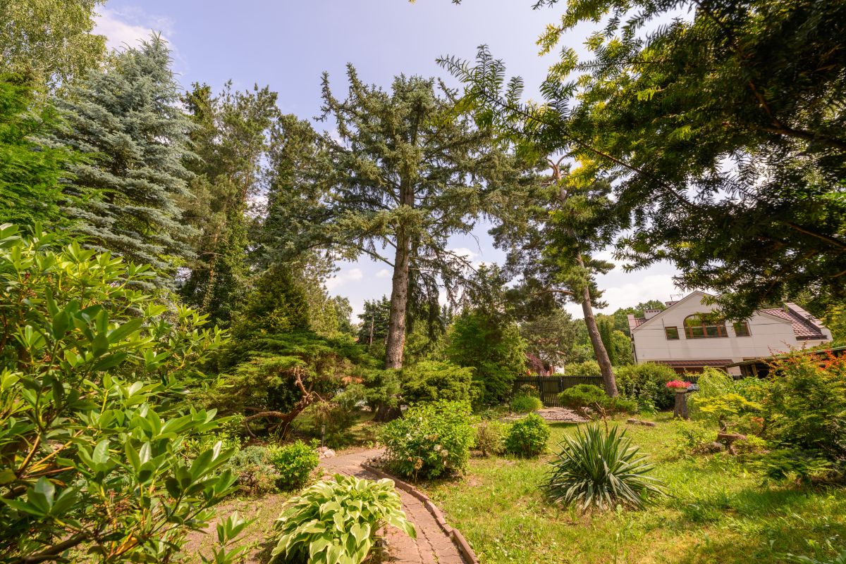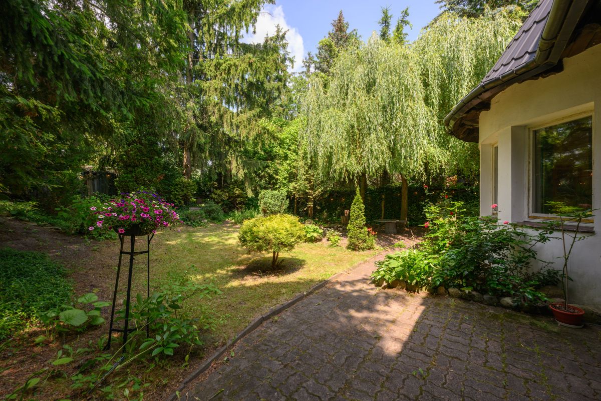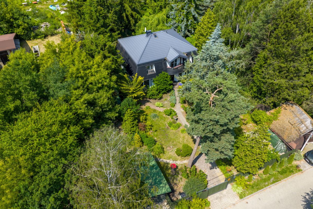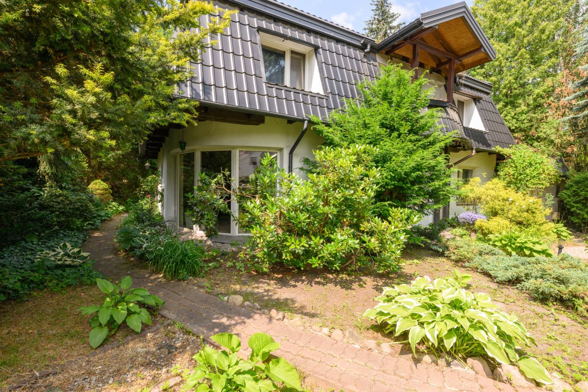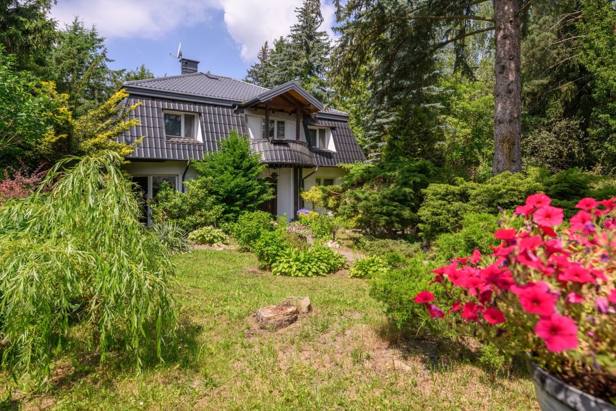 Dom jest otoczony zielenią. Bardzo duży ogród ze starodrzewiem oraz licznymi nasadzeniami zapewnia prywatność i wyjątkowo przyjemną przestrzeń do spędzania czasu na zewnątrz. Zieleń otaczająca dom zagląda do wnętrz i tworzy poczucie bezpośredniego kontaktu z sąsiadującą naturą, atrakcyjną o każdej porze roku. Na terenie działki znajduje się także klimatyczne oczko wodne, taras oraz drewutnia.
