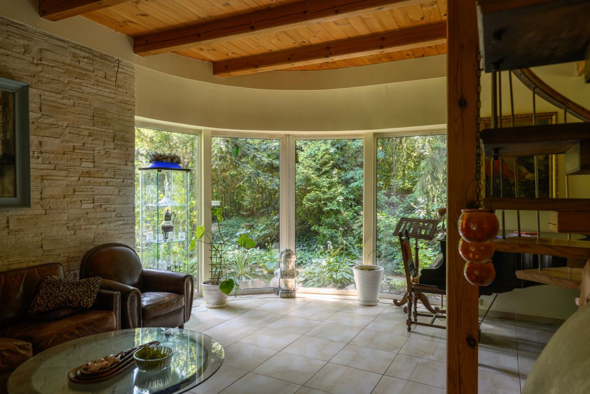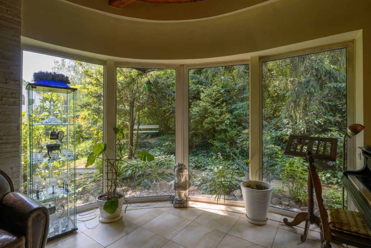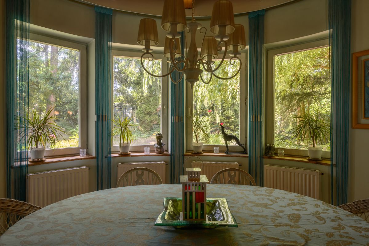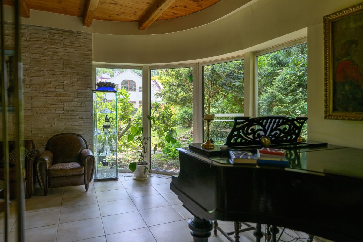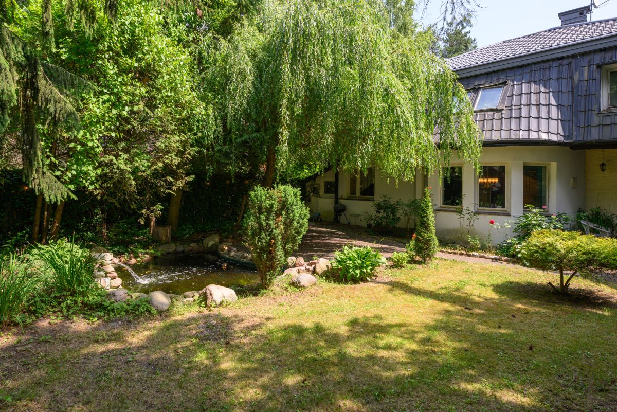 Dom jest otoczony zielenią. Bardzo duży ogród ze starodrzewiem oraz licznymi nasadzeniami zapewnia prywatność i wyjątkowo przyjemną przestrzeń do spędzania czasu na zewnątrz. Zieleń otaczająca dom zagląda do wnętrz i tworzy poczucie bezpośredniego kontaktu z sąsiadującą naturą, atrakcyjną o każdej porze roku. Na terenie działki znajduje się także klimatyczne oczko wodne, taras oraz drewutnia.