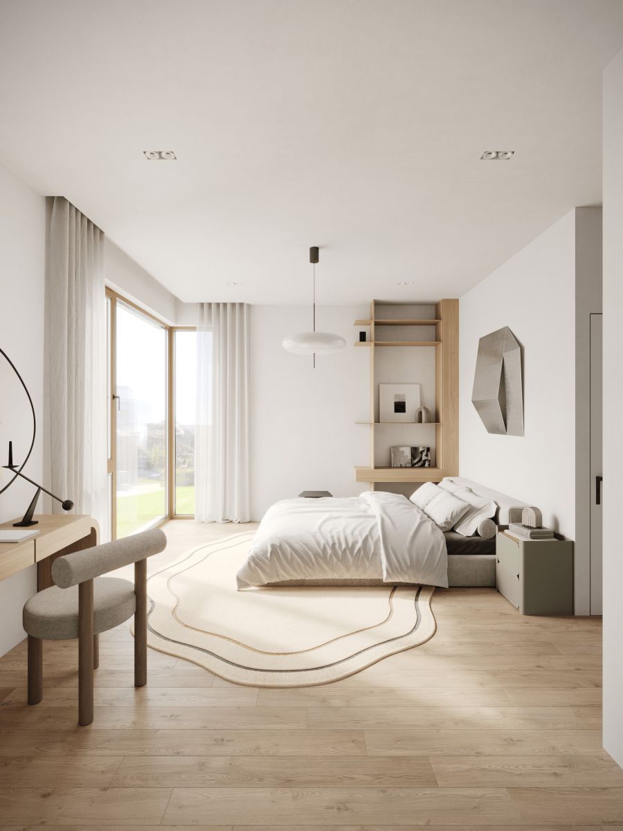 Na piętro prowadzą lekkie, nowoczesne schody na stalowej konstrukcji ze stopniami z betonu strukturalnego. Górna kondygnacja oferuje trzy sypialnie i dwie łazienki, w tym master bedroom z prywatną łazienką i dużym, panoramicznym oknem.