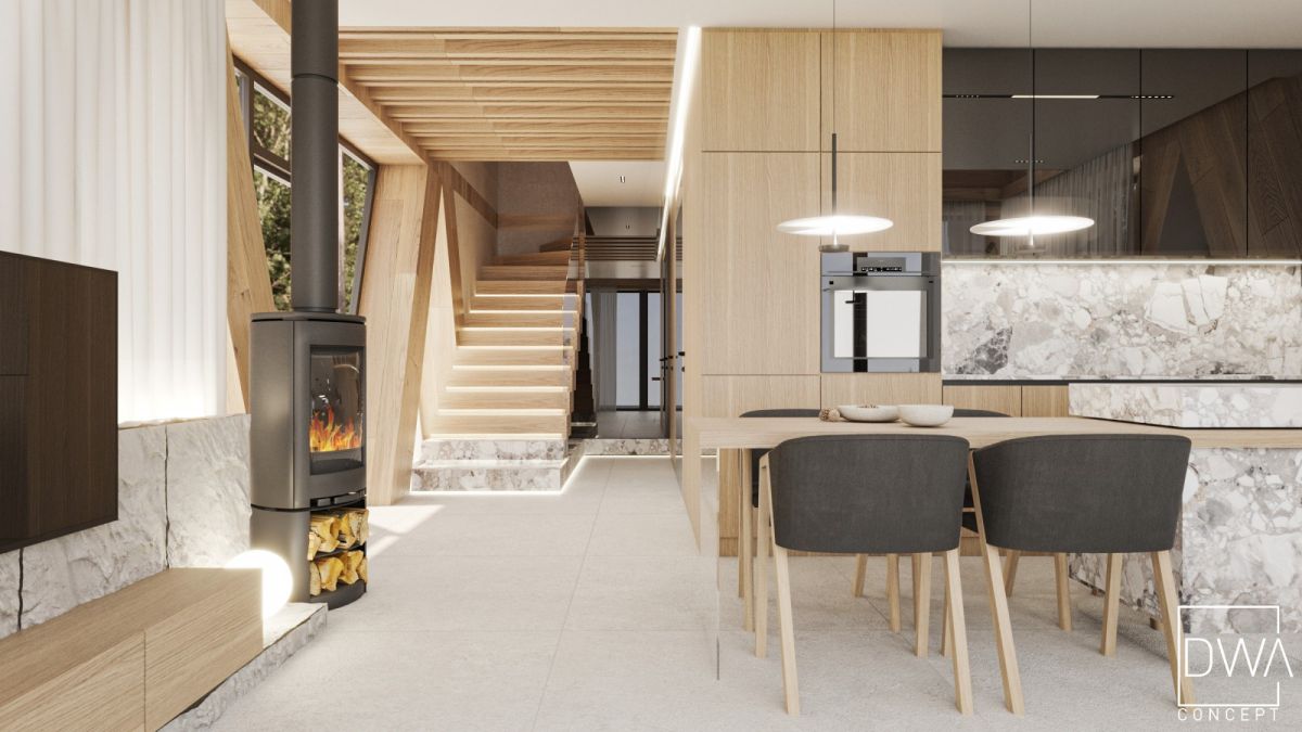 Budynki łączą nowoczesną formę z tradycyjnymi elementami architektury regionu. Geometryczne kształty oraz dwuspadowy dach inspirowany tradycyjną zabudową pasterską doskonale wpisują się w lokalny krajobraz. Dom został wykończony naturalnymi materiałami, takimi jak kamień łamany i drewno, co podkreśla jego unikalny charakter.