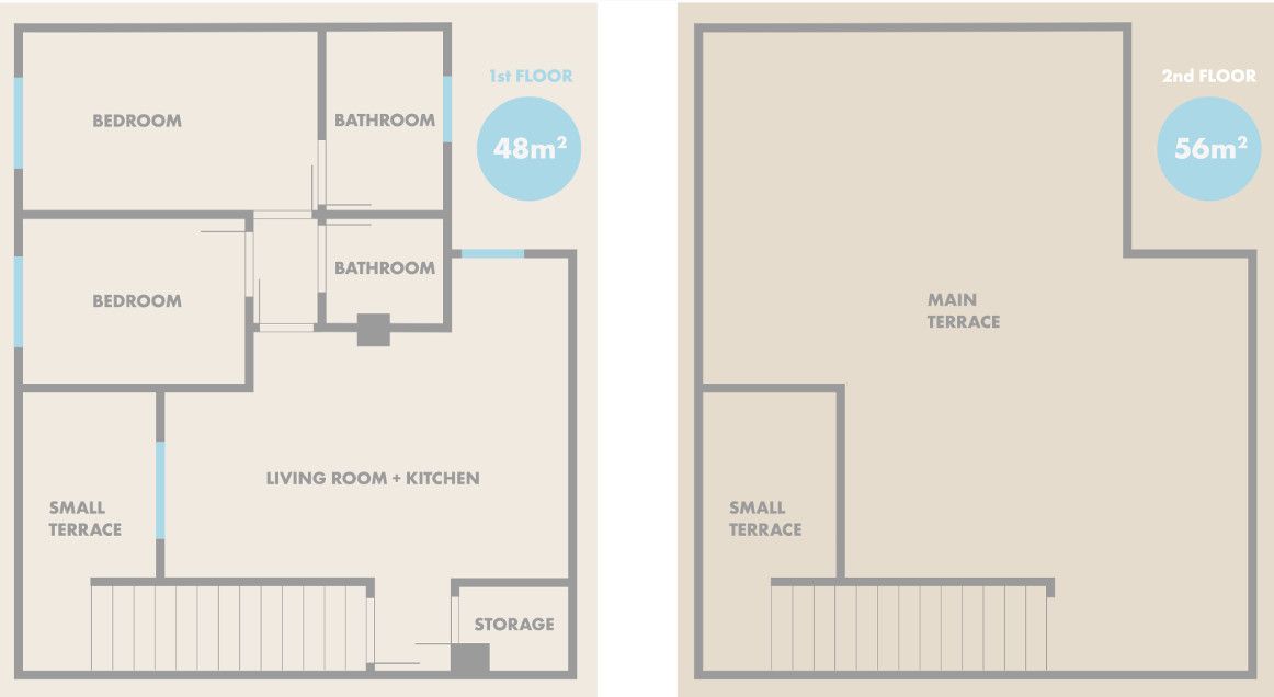 dwóch poziomów - pierwsze piętro to część mieszkalna o powierzchni 48 m², natomiast drugie piętro to przestronny taras na dachu o powierzchni 56 m².