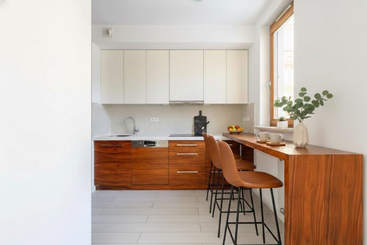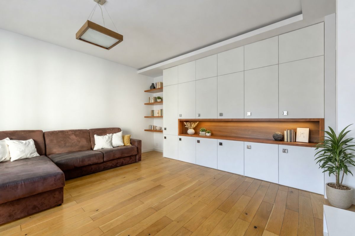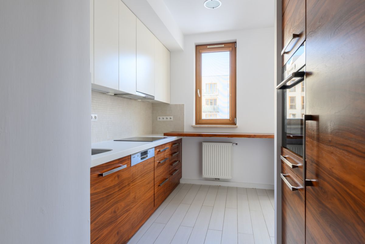 Kuchnia w pełnej zabudowie ze sprzętem AGD: duża lodówka, zmywarka, piekarnik, płyta indukcyjna, ukryty okap. Meble wykonane na zamówienie, lakierowane i fornirowane fronty, blat z corianu. W przedpokoju i salonie dodatkowe szafy stolarskie. Na podłogach deska barlinecka. Pralka schowana w zabudowie.