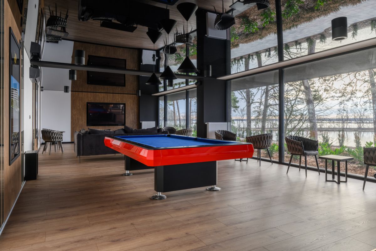 Prywatna plaża i pomost: Bezpośredni dostęp do wody, idealny na letni wypoczynek czy sporty wodne. Strefa Wellness & Sport: W pełni wyposażona prywatna siłownia. Strefa Rozrywki: Sala klubowa z bilardem, TV i piłkarzykami - idealna na spotkania ze znajomymi w chłodniejsze dni. Rekreacja: Altana grillowa, plac zabaw dla dzieci oraz zadbane tereny zielone.